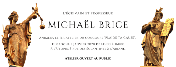 Michael Brice, enseignant et écrivain niçois a eu le plaisir d’ouvrir la série des 15 ateliers du concours. Nous nous sommes tous réunis Dimanche 5 janvier 2020 au local de l’Utopie, à l’Ariane. Il s’agissait de littérature, évidemment ! Les candidates et le public présent ont appris les notions du lexique judiciaire, les principes de la rhétorique et le sophisme. Michael a fini par quelques lois de Schopenhauer sur l’art de convaincre. Tout un programme.